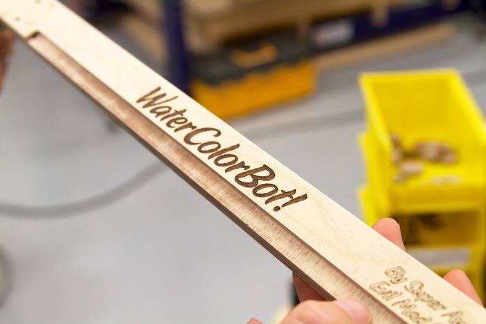 Because we're manufacturing it in-house, we've been able to prototype our manufacturing processes in parallel with the design, every step of the way. We're also building on two years of experience of manufacturing our Ostrich Eggbot kit, which is also made from a combination of CNC routed and laser cut wood and Delrin parts, along with the same motion-control platform that drives the WaterColorBot.
