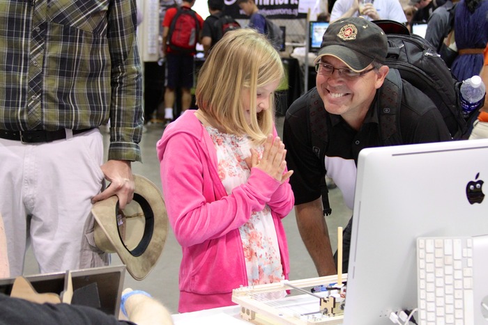 Together we designed and built our first prototype in February, and had a nicely-working robot about a month later. As we realized that this project had a lot of appeal beyond just a one-off project, we started developing it into a kit. Sylvia exhibited her prototype at RoboGames (and won a Silver medal), and we also brought the WaterColorBot to Maker Faire, where thousands of people got to play with it.